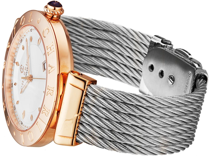 | Bezel Material | Polished rose goldtone PVD coated stainless steel, with 'CHARRIOL' engraved |