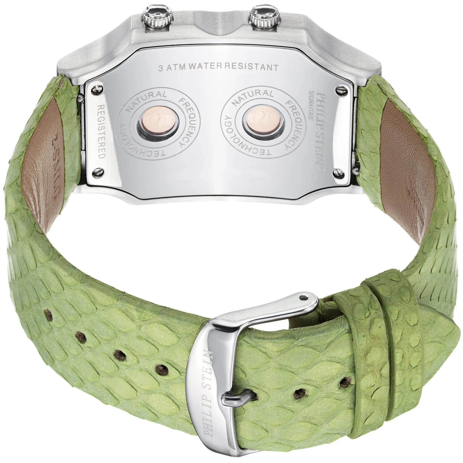 Stainless Steel, Tang (pin) buckle with Philip Stein logo